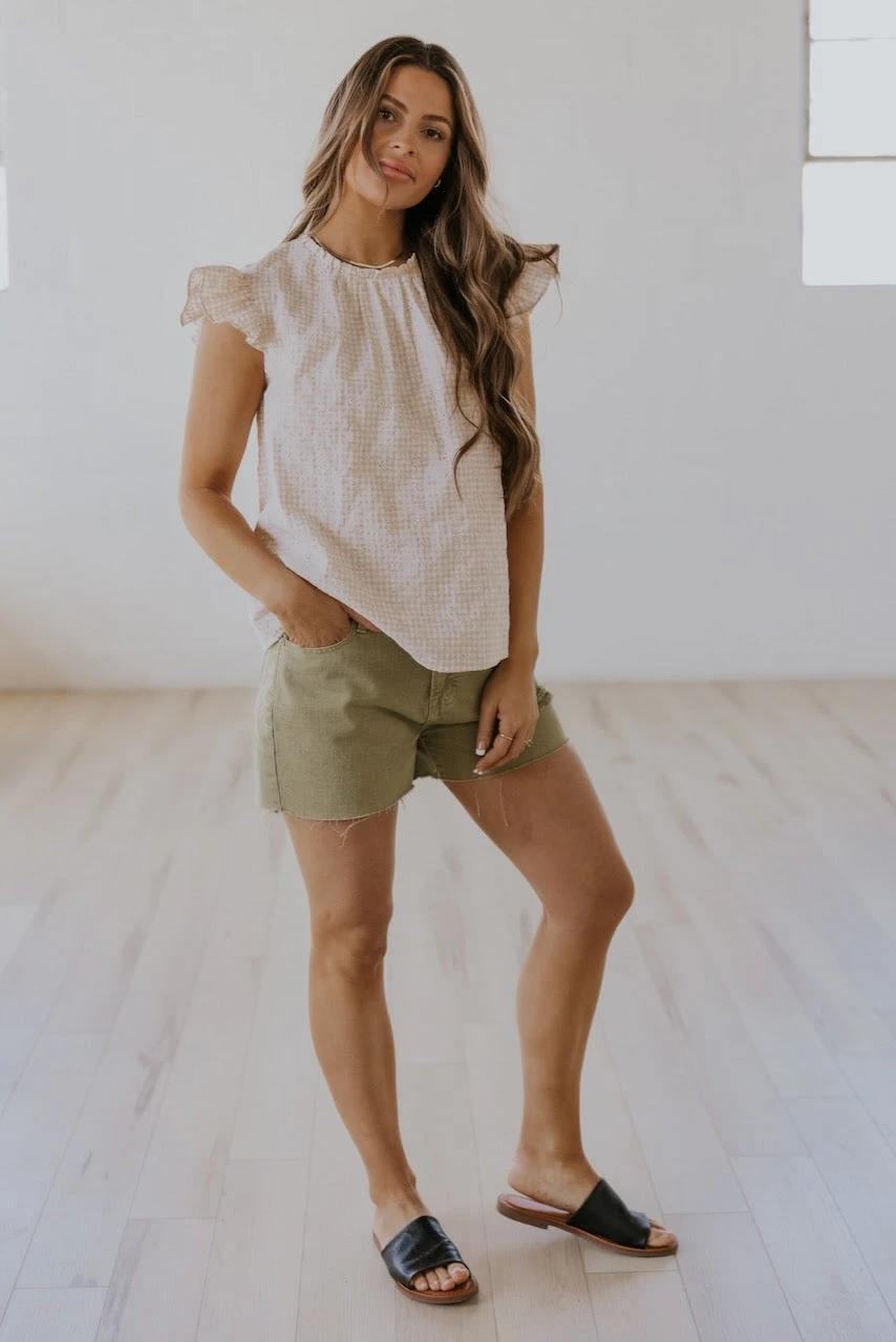 Experience the freedom of style with the Break Free Flutter Sleeve Blouse, a charming neutral gingham blouse that captures the essence of effortless chic. The blouse features a sophisticated high neckline and delicate flutter sleeves, adding a touch of femininity to your ensemble.