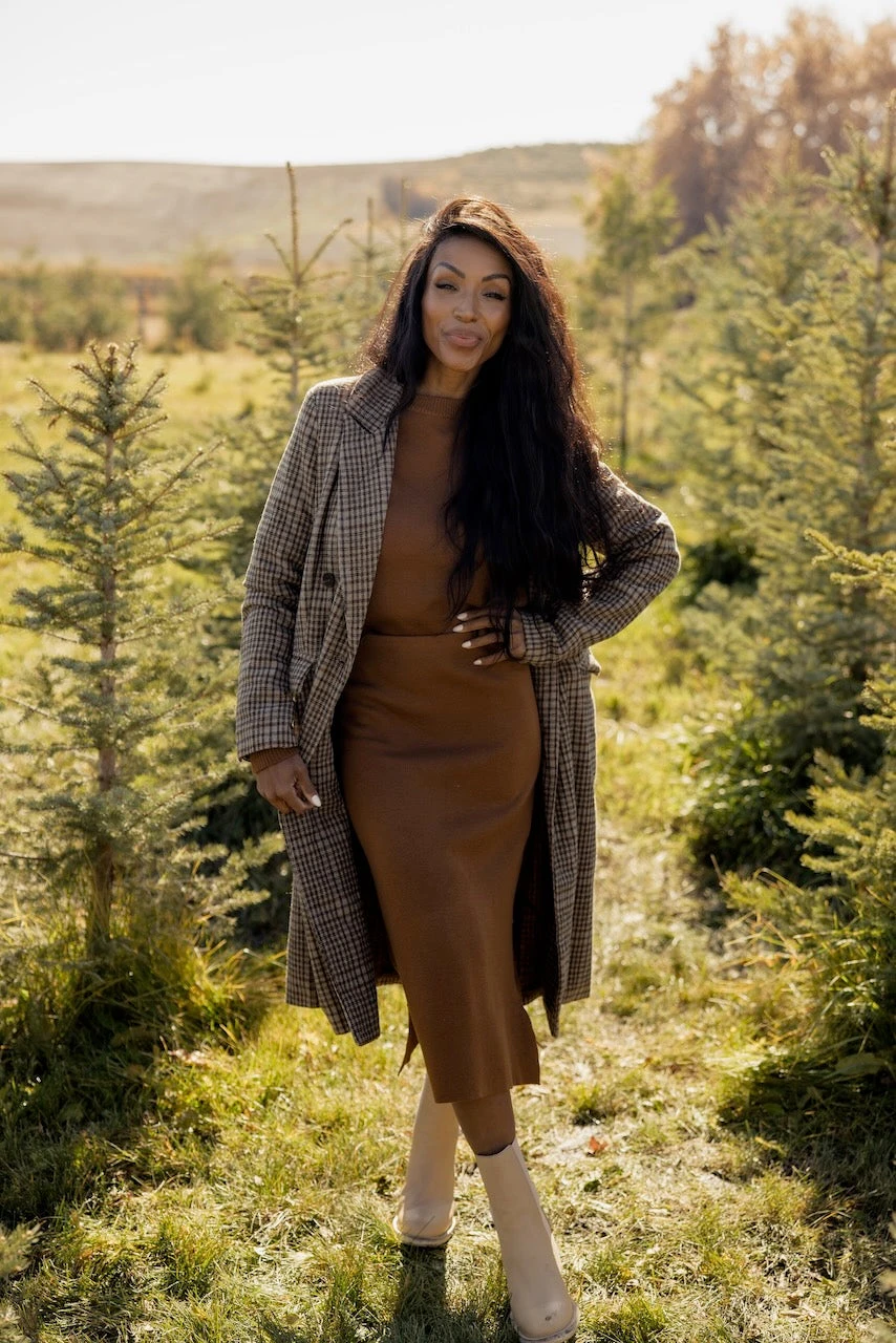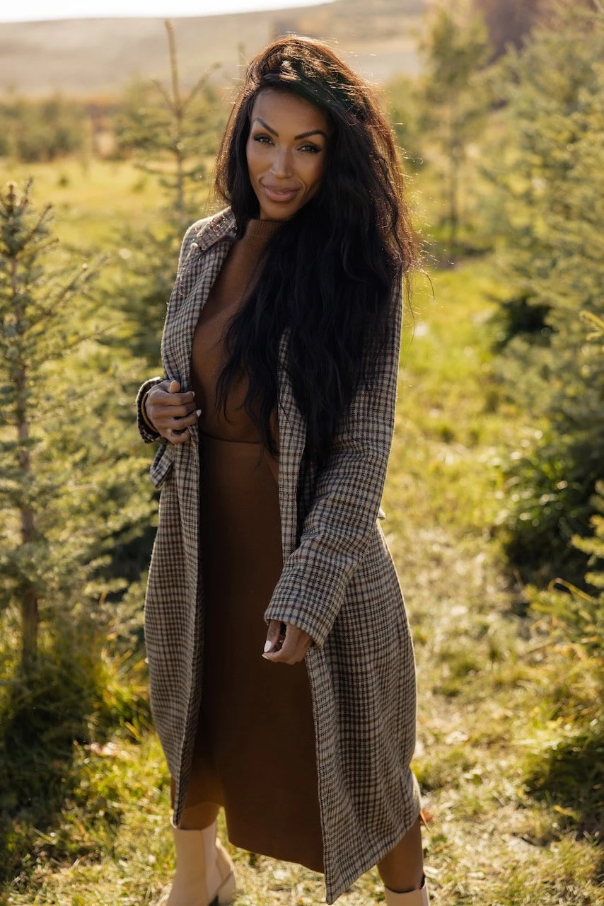 chocolate // paired with the stromwell mock neck sweater, brightly shining balloon sleeve sweater, free people essential chelsea boots in antiquewhite, + lovely day double breasted plaid jacket