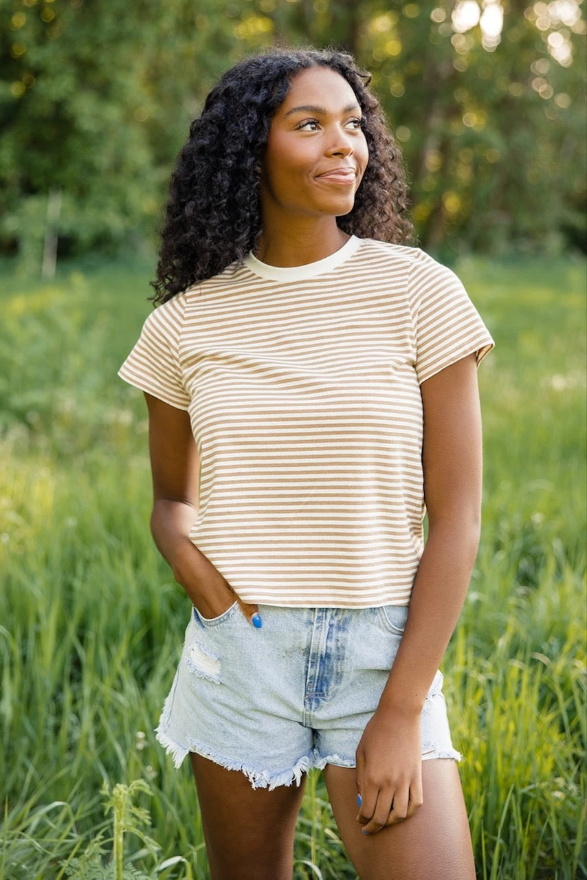 Everyone needs a classic striped tee and this one has some special features! It has a contrasting white collar and two fun colors to choose from. The Camp Rock Stripe Tee is easy to pair under your favorite Hot Shot Onesie, with your bootcut jeans, or your cutoff shorts. Everybody needs one of these tees!