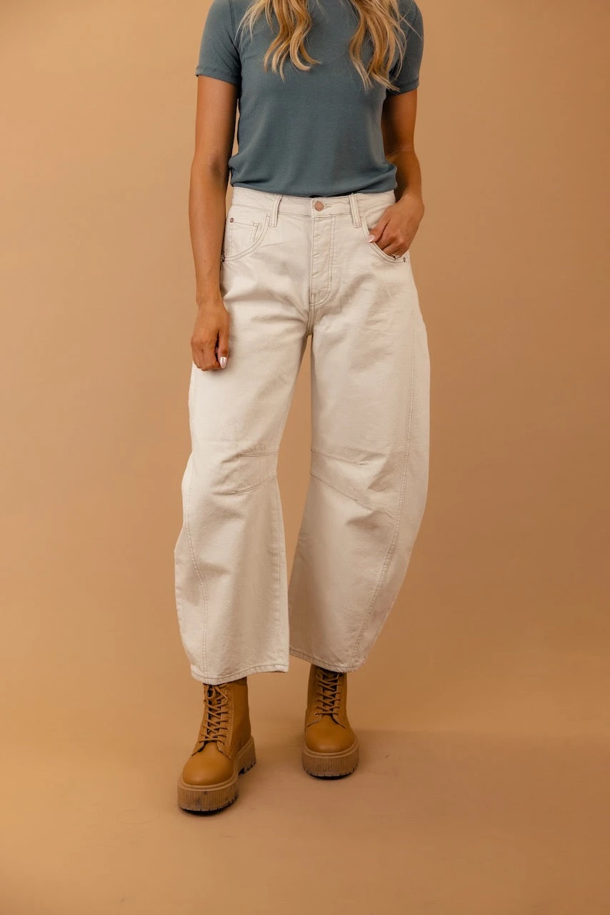 Lucky you! The trendiest jeans this season are barrel jeans, and for good reason! They feature a hidden button fly and functional pockets. Pair them with tees, pullovers, and sweaters this season!