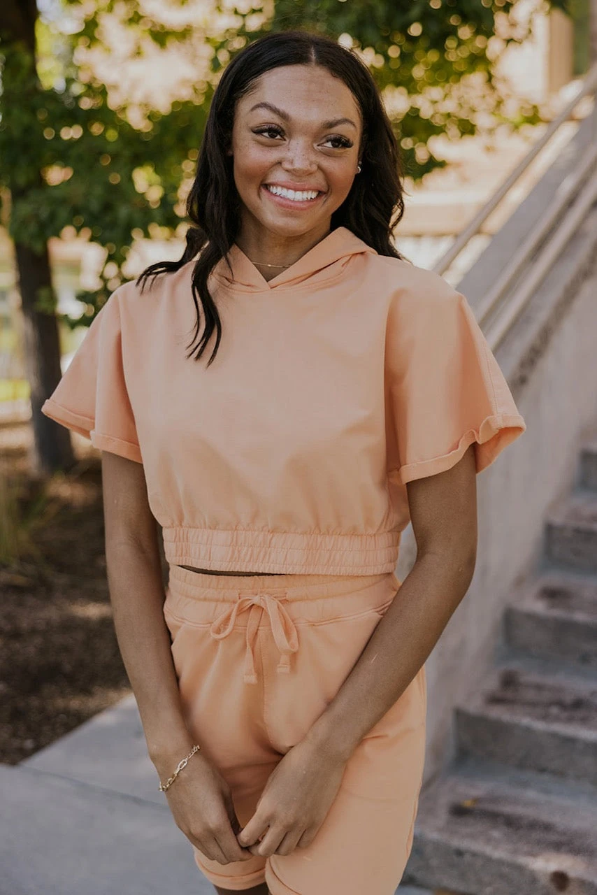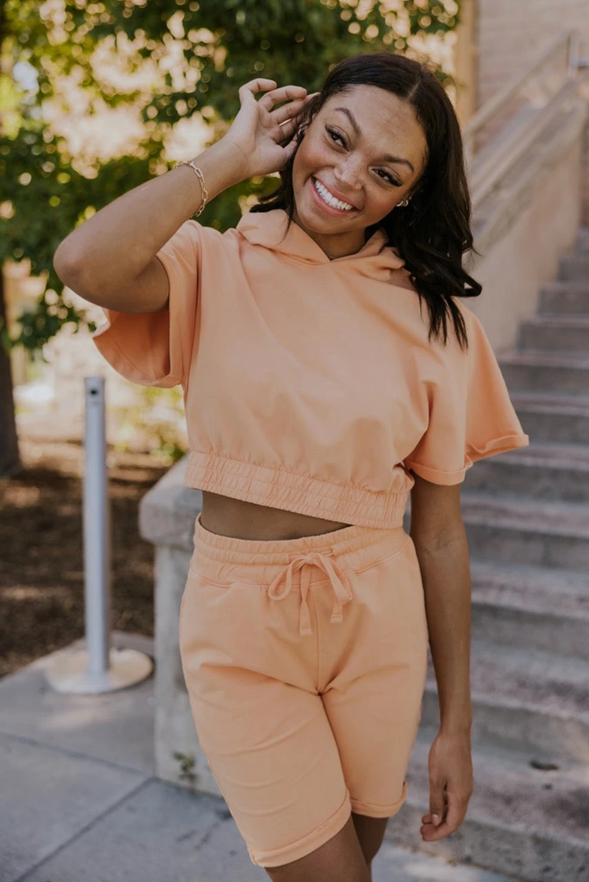 Holy crop. This cropped sweatshirt features a hood, short sleeves, and elastic waistband—sporty but also feminine. Made with oh-so-soft fabric, this sweatshirt is also lightweight and comes with matching shorts to complete the look. Wear this versatile style solo or layer up.Â