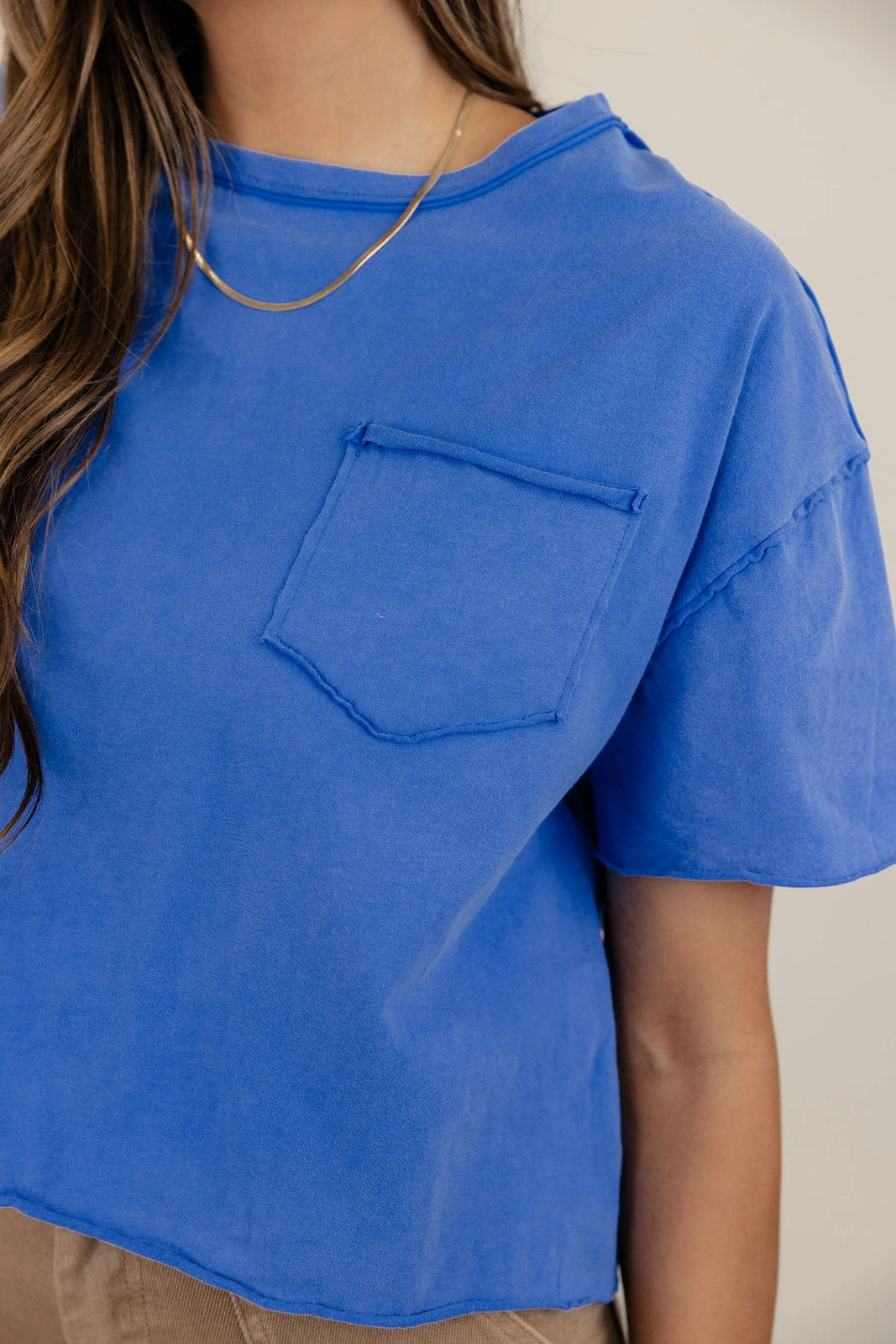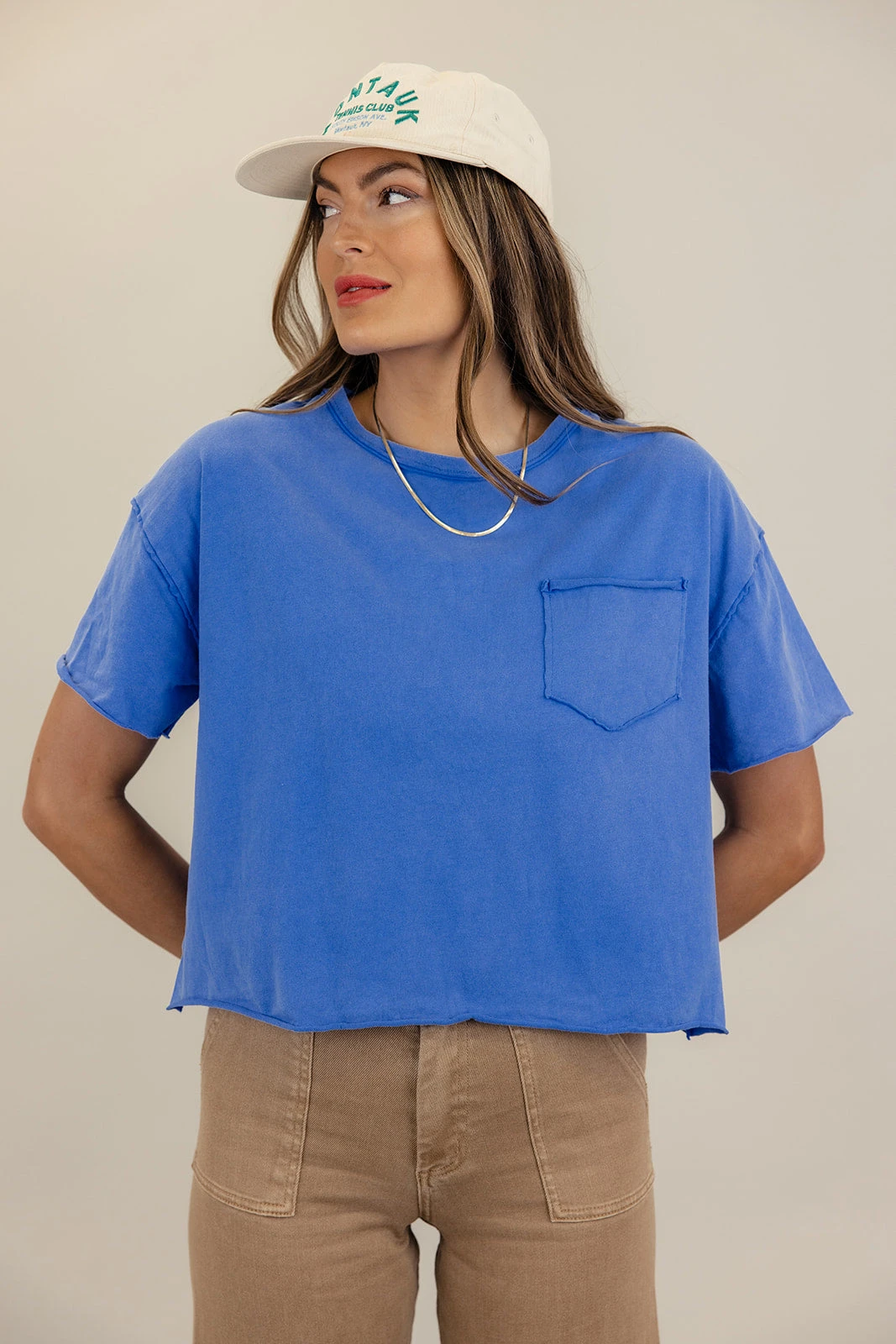 This tee features a boxy fit, a front patch pocket, and stiff, soft cotton. The Out of the Blue Crop Top has a classic rolled hem and slightly cropped fit, making it a favorite for summer. The stunning blue will pair well with anything in your closet.