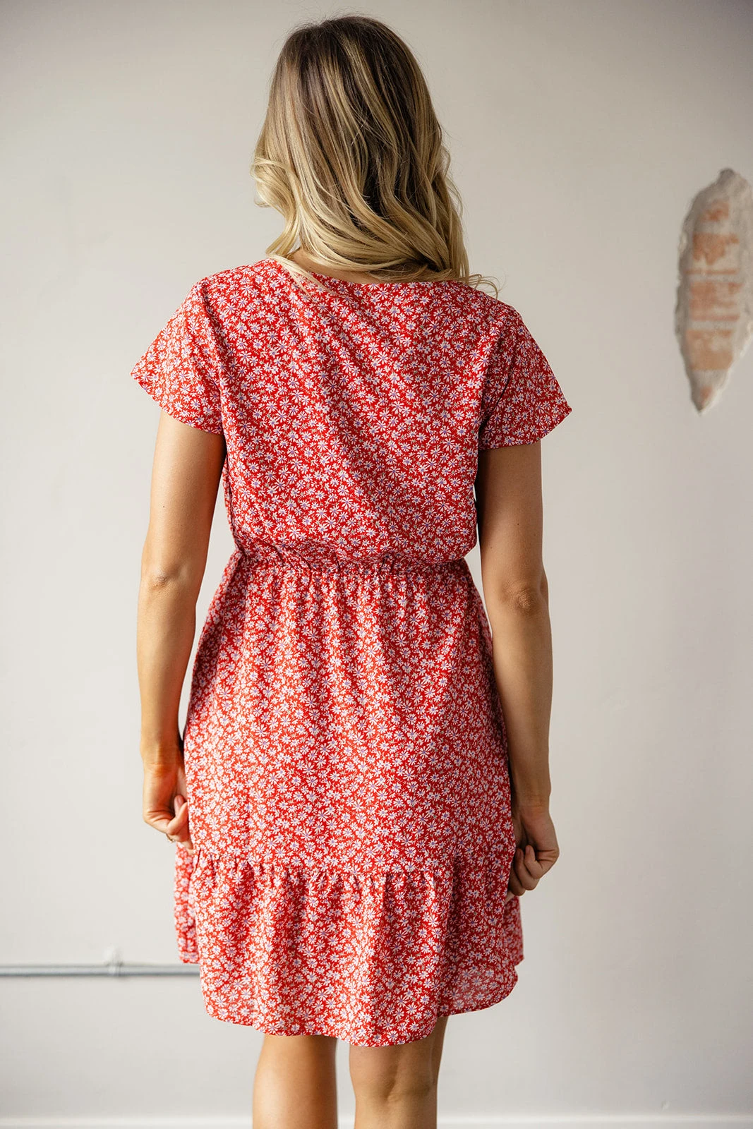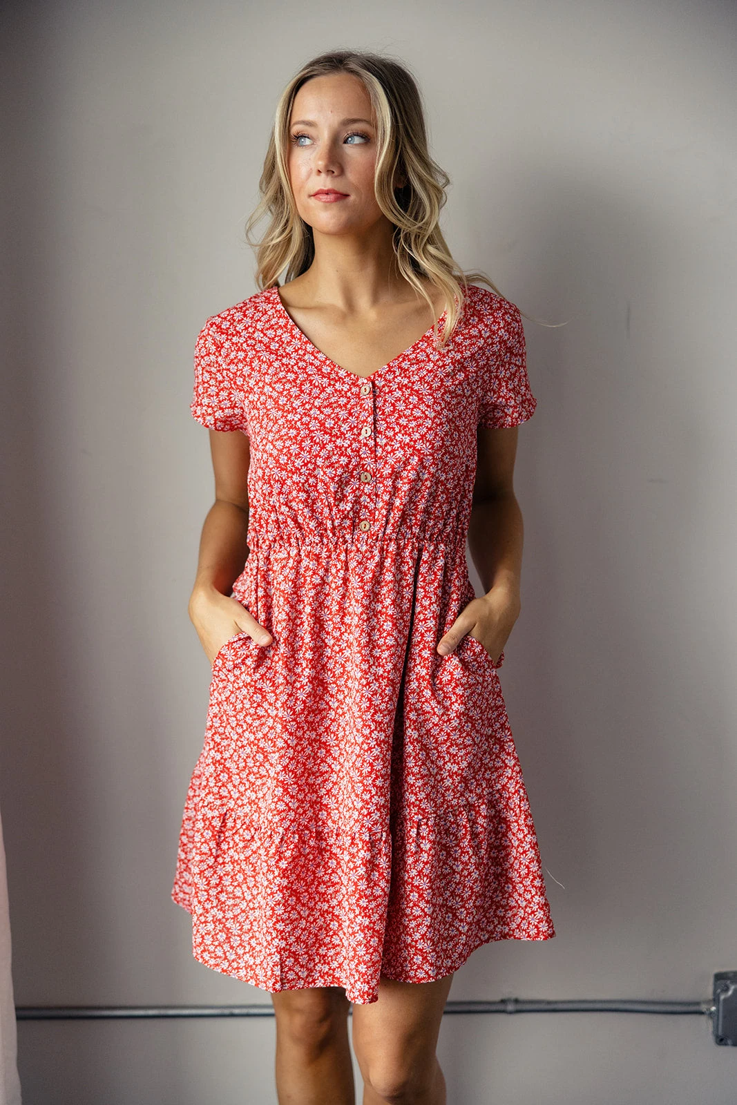 Step into enchantment with the Pixie Dust Floral Dress in a stunning shade of red. This short dress features a charming floral print and functional buttons for added style and convenience. The v-neckline adds an elegant touch, while the ruffle hem creates a whimsical and playful look. Pair with your favorite sneakers and cardigan or throw on a pair of heels and dance the night away!