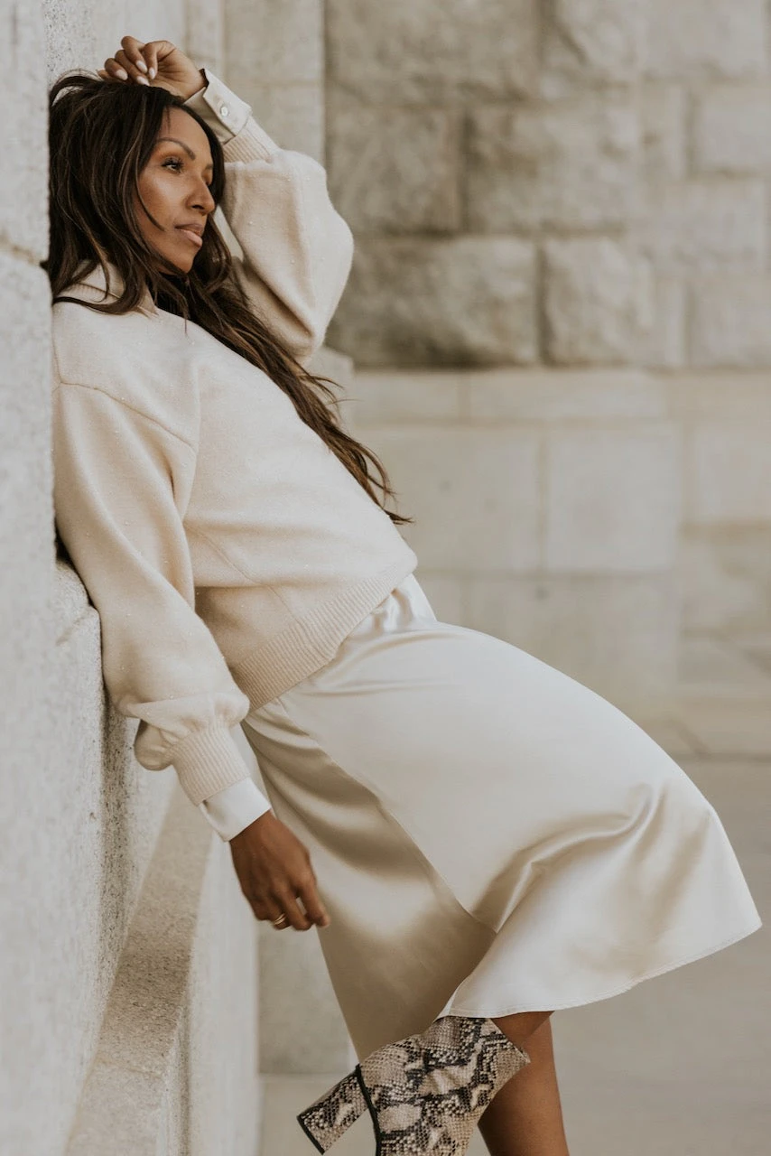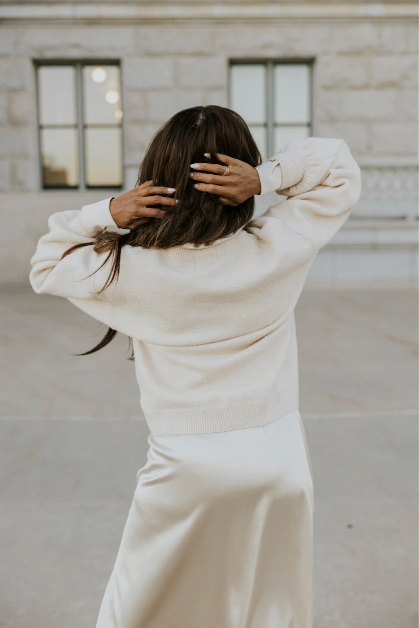 Two words: absolutely timeless. Like falling snow, small pearls are beaded throughout. Which is the most delicate + stunning detail a sweater could have, bishop sleeves being a very close second. Effortlessly dress up or dress down, you can’t go wrong in an understated classic like this one.