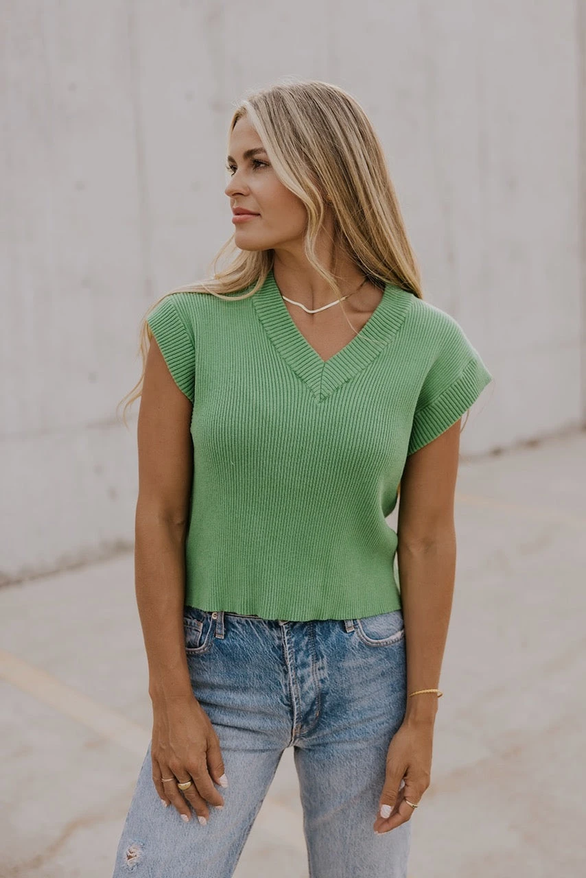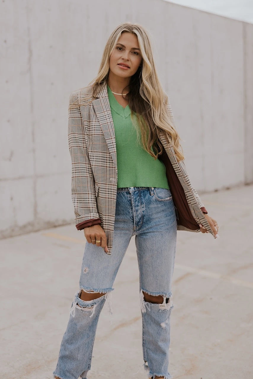 Sweater vests are a fall-time staple piece and this particular one comes in the perfect Kelly green color. Effortlessly pair this vest with your favorite high-waisted denim, skirts, + trousers to accomplish any look you want! She’s a top you can wear to work, out with the girls, or to preschool pick-up. It’s versatile like that.