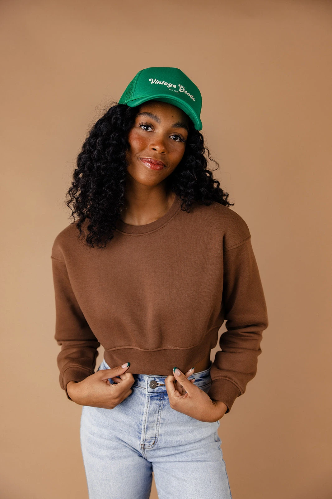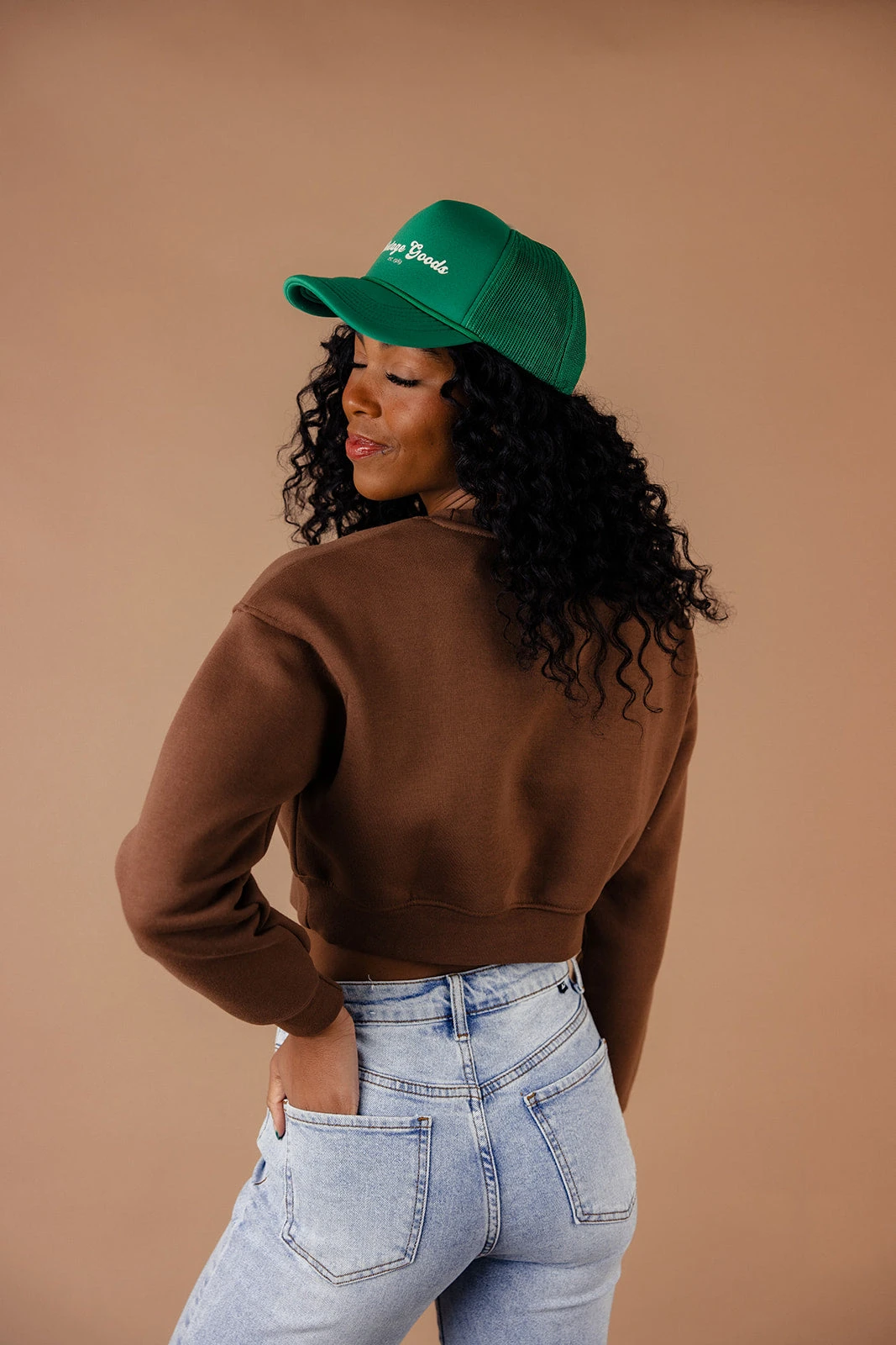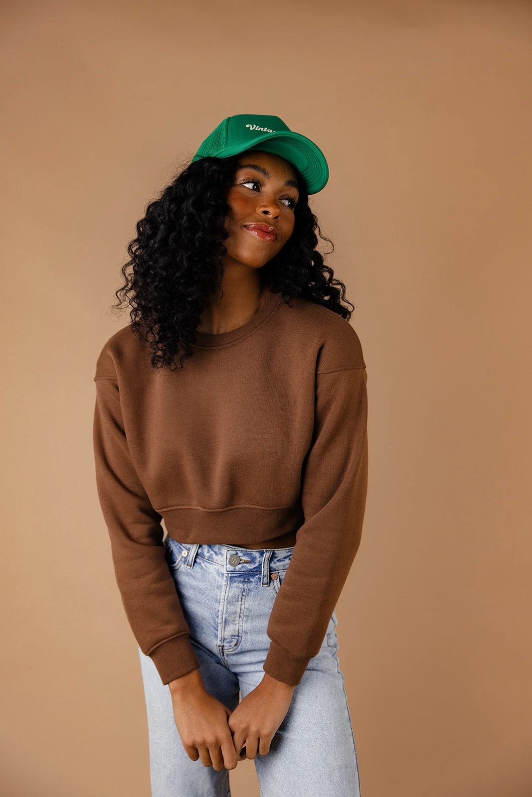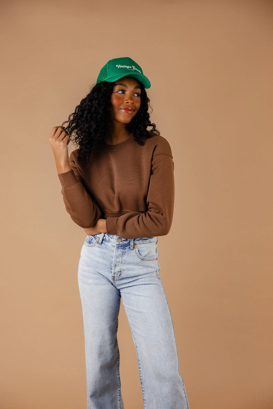 A chocolate brown cropped pullover? What more could you want! This classic pullover features a drop shoulder, cropped fit, and a crew neckline. Be sure to grab the matching sweatpants for a to-die-for set!