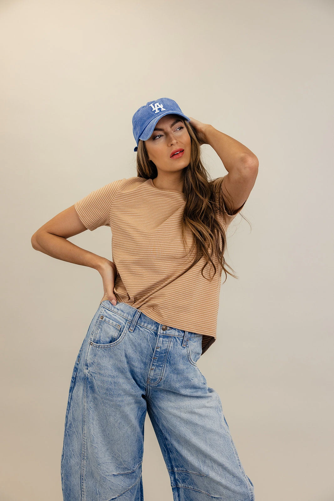 This charming wardrobe staple features small, delightful stripes and a boxy fit. With its soft, stretchy fabric and rounded neckline, it’s sure to become your go-to piece for both lounging and outings.