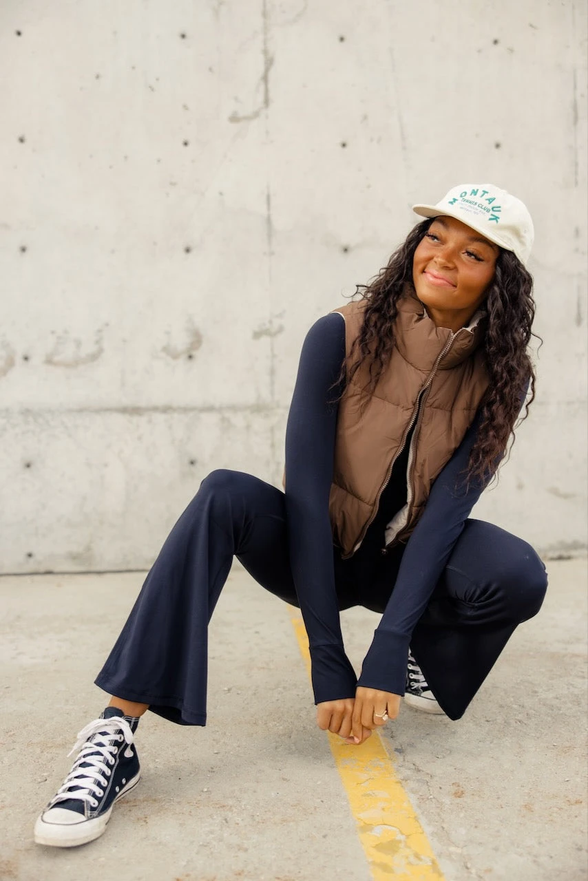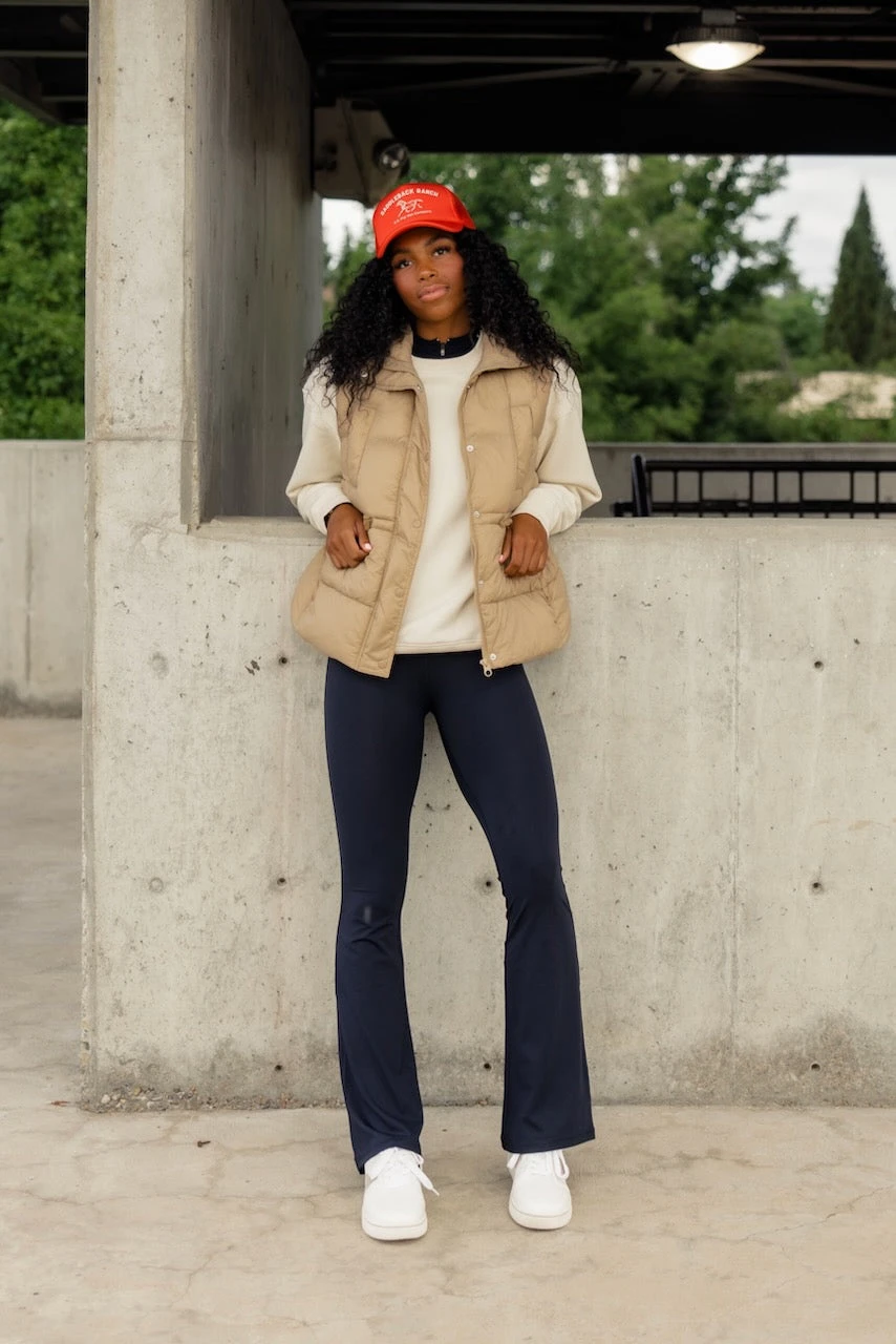 // paired with call it magic plaid shacket in steelblue, all fenix rise sports bra, never better sweatshirt in ivory, strangest feeling puffer vest, + mia krew casual sneakers in burlywood