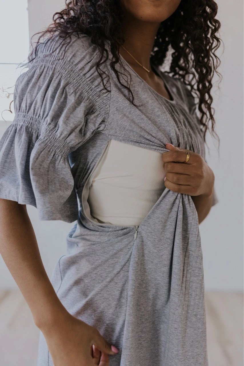 Cheers to your new favorite dress (which can be worn year-round). Bell sleeves that make a statement and we are here for it. With nursing-friendly zippers on both sides, this dress was made with mamas in mind.Â