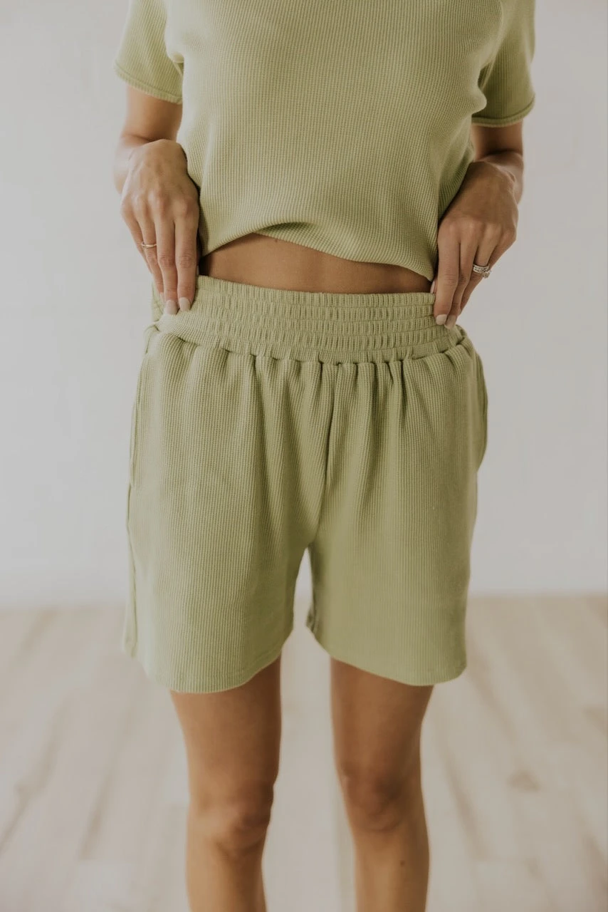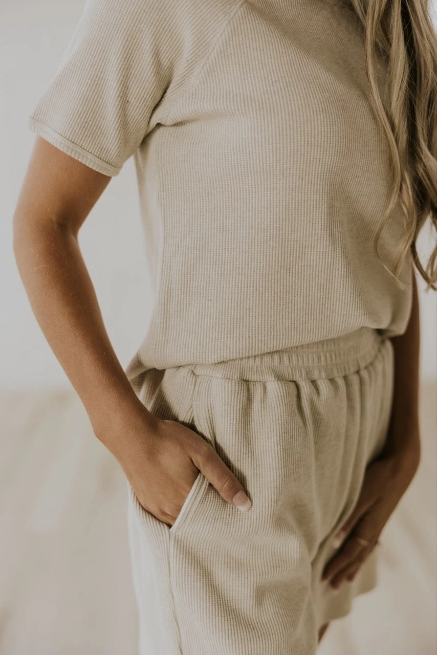The Peggy Shorts feature an elastic waistband, pockets, and the perfect ribbed material. Mix and match or keep it simple, these shorts are perfectly paired with the matching tee! This is a simple and classic set to add to your wardrobe.Â